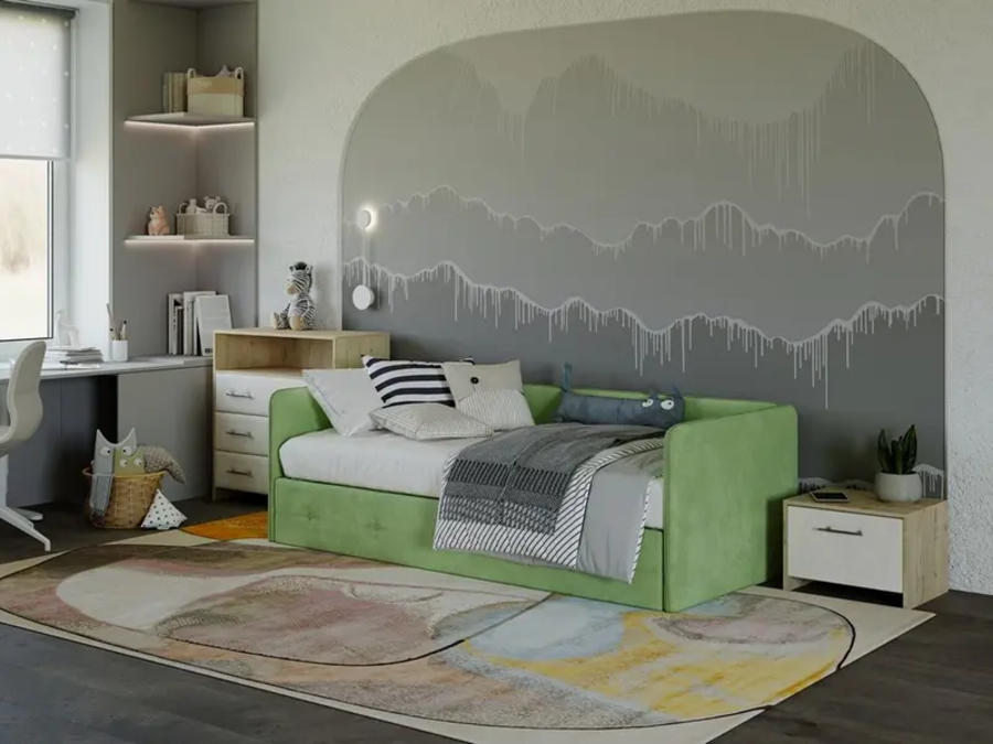 Детская кровать, которая при желании превращается в угловую кровать или кровать-диван с подлокотниками-бортиками с обеих сторон.